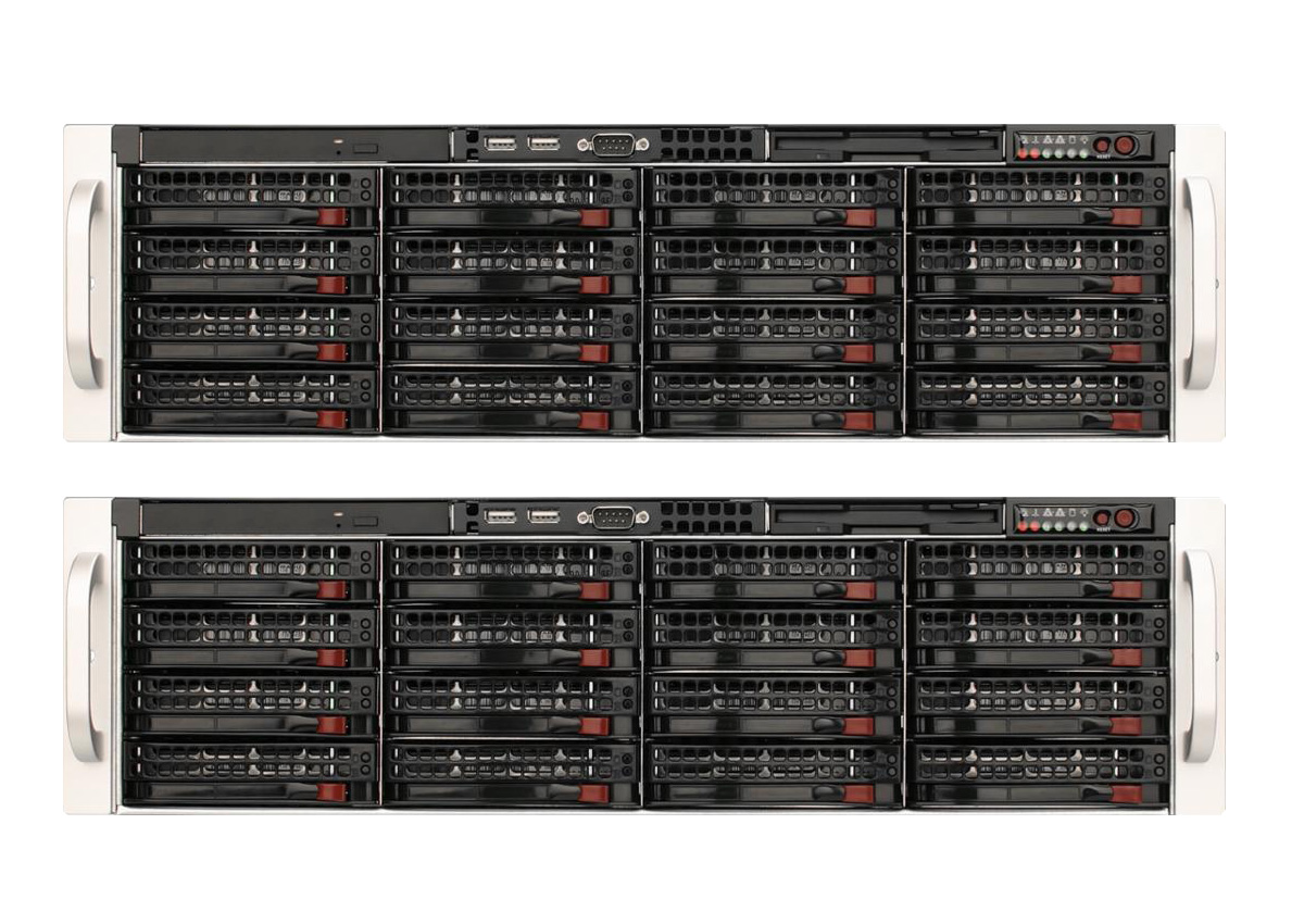 vFleXtor® 1006.3 delivers a self-sufficient, highly available, redundant and fault tolerant computing environment which maximizes the storage and computing of a 6U form factor by offering rackmountable solution including 32 hot-swap 3.5" drive bays for shared storage (2x16 mirrored)